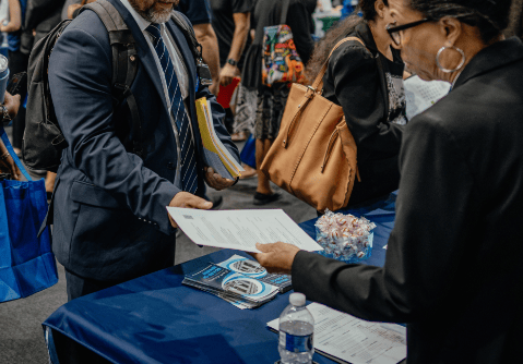 6月芝加哥的一场招聘会上,招聘人员正与求职者交谈。