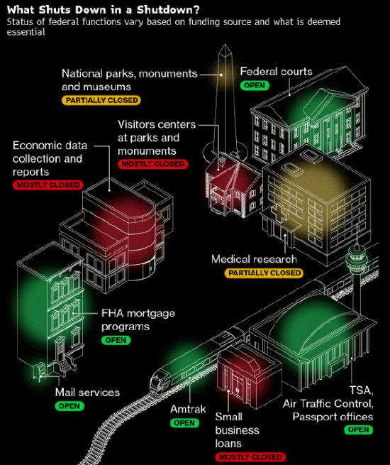 根据宪法,国会议员仍可领取薪酬,并且必须能够工作以通过新的支出法案重新开放政府。但一些辅助机构,如国会图书馆和植物园将对游客关闭。