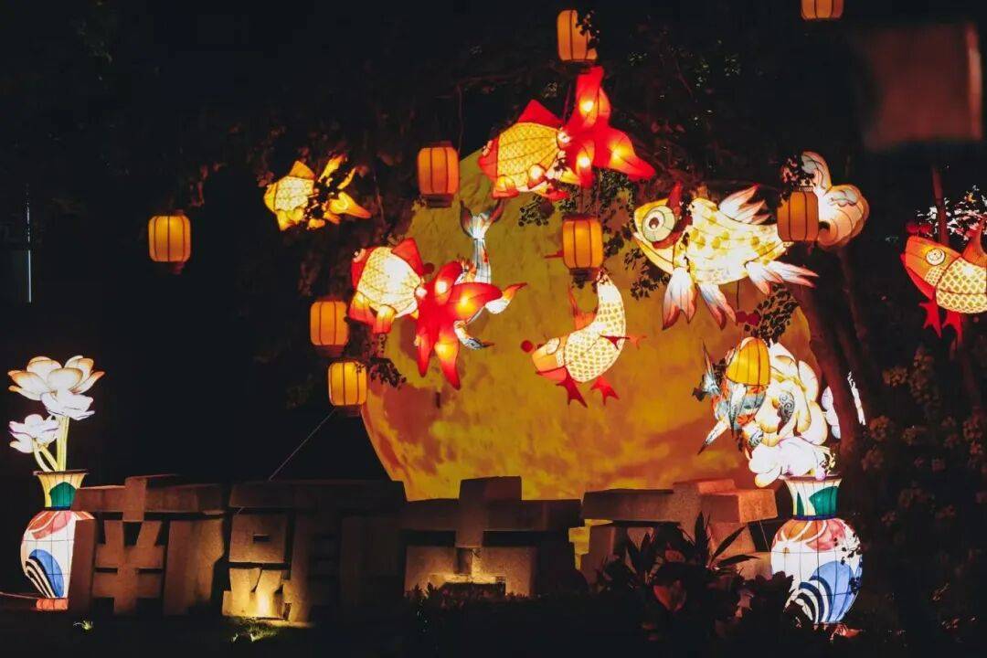 在中山公园的灯火百家主题灯展,中国百家姓装点在传统灯笼之上;另一头的荷兰花卉小镇,里里外外也被彩色花灯装点。