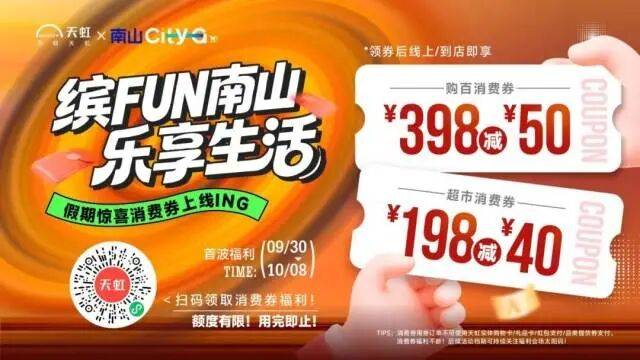 在综合消费领域,“南山CityGo”系列消费券活动同步上线,发放总额超5000万元的消费券,联动淘宝闪购、京东、抖音等线上平台,支持天虹、盒马、京东MALL、深圳湾万象城二期等线下商业体,通过“线上+线下”模式,覆盖餐饮、3C数码、家用电器、日用百货等多个消费场景发放消费券,全方位满足市民多样化需求,助力本土品牌发展。