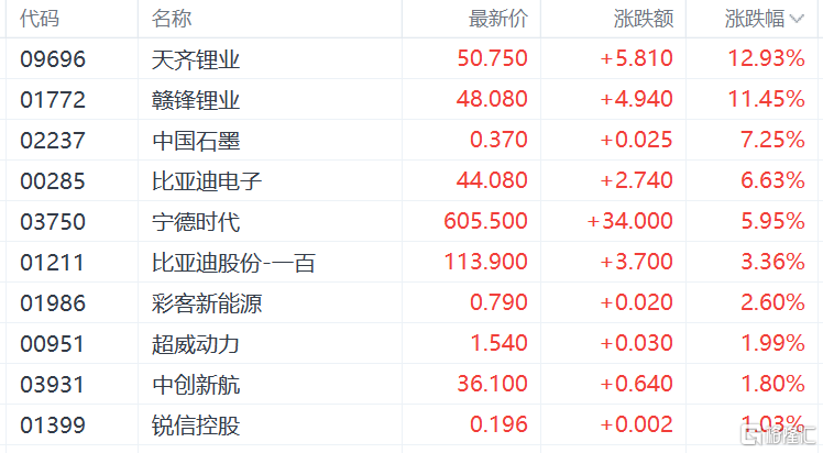 锂电股走强,天齐锂业涨近13%,赣锋锂业、比亚迪电子、宁德时代、比亚迪股份等跟涨。