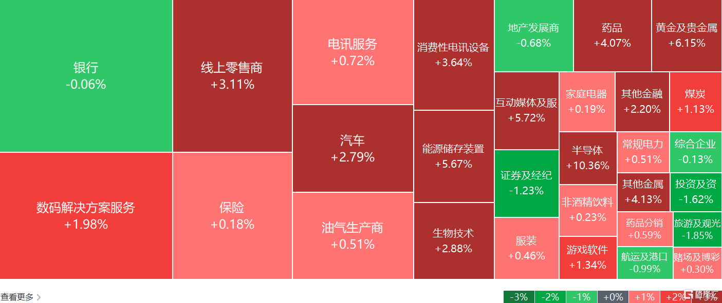 盘面上,大型科技股集体走高,快手大涨超8%,百度涨超4%,阿里巴巴、小米、京东涨超3%;半导体、芯片股走强,中芯国际涨超12%;黄金股延续涨势,中国白银集团大涨超30%;苹果概念股活跃,蓝思科技涨近9%;锂电股走强,天齐锂业涨近13%;汽车股走高,蔚来涨超6%;生物医药股、稀土概念、机器人概念股、有色金属股等上涨。