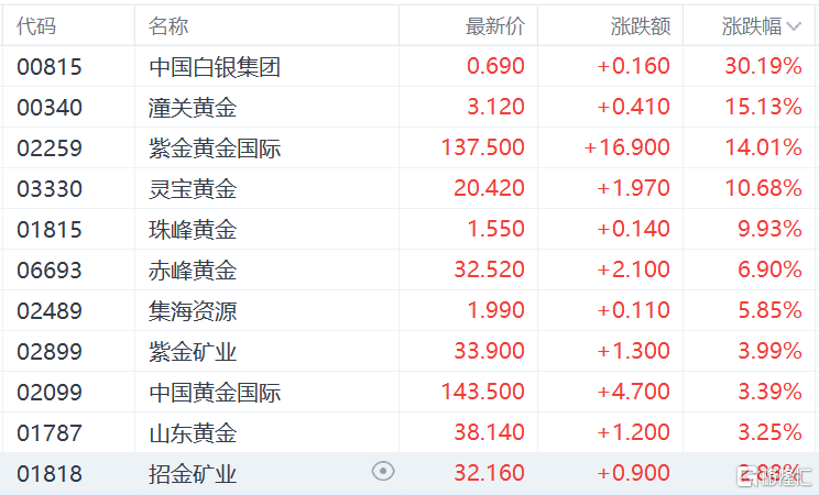 黄金股延续涨势,中国白银集团大涨超30%,潼关黄金、紫金黄金国际、灵宝黄金、珠峰黄金、赤峰黄金、紫金矿业等跟涨。
