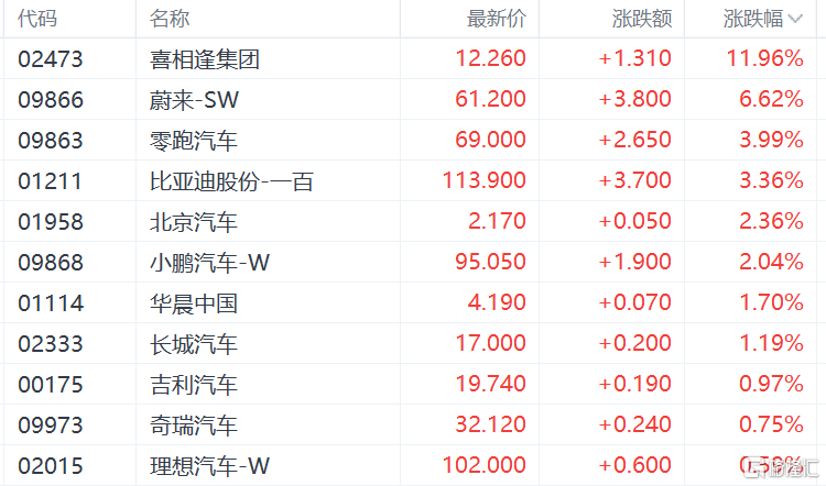 汽车股走高,蔚来涨超6%,零跑汽车、比亚迪股份、小鹏汽车、吉利汽车等跟涨。
