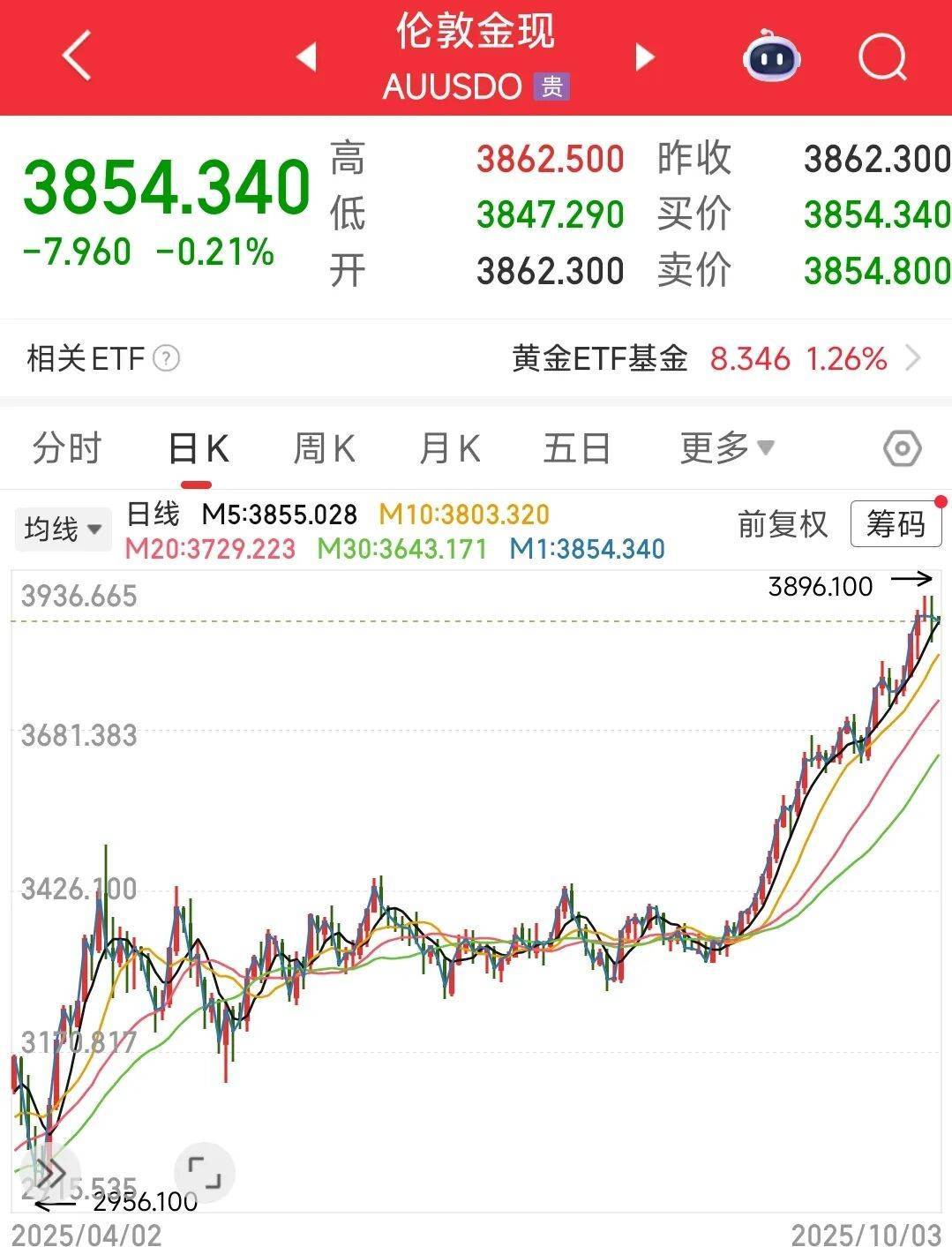 今年以来,现货黄金价格持续上涨,10月2日,现货黄金震荡拉升,盘中最高触及3896.1美元/盎司,再创历史新高。
