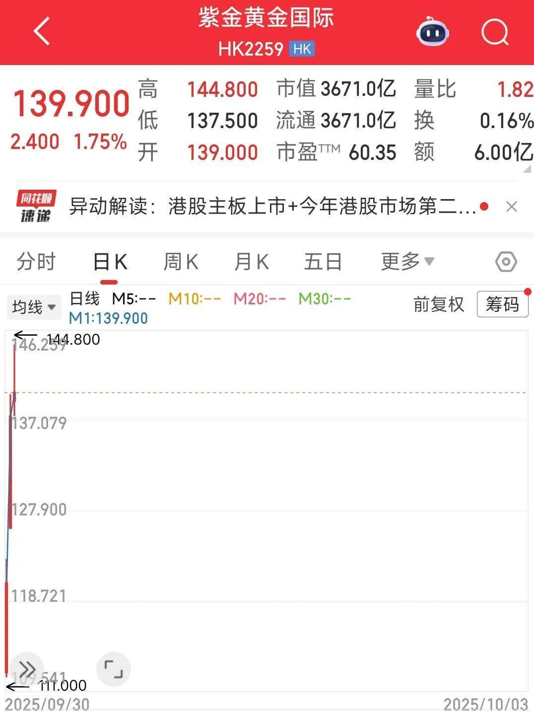 继续大涨!黄金大牛股,突传重磅 【大河财立方消息】10月3日,港股开盘后,紫金黄金国际(HK.2259)高开,并快速上涨超过4%。 ...