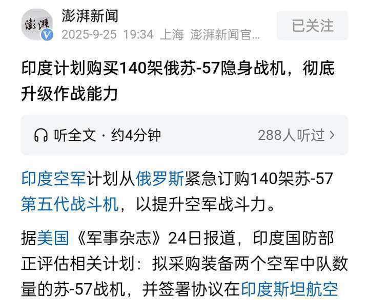 紧接着,印度又把目光投向了俄罗斯的苏-57,这款被印度视为“唯一可以媲美五代机”的战机。印度计划购买140架苏-57,期望凭借其“隐身性能”和远程打击能力,在空战中占据优势,深入巴基斯坦腹地进行精准打击。