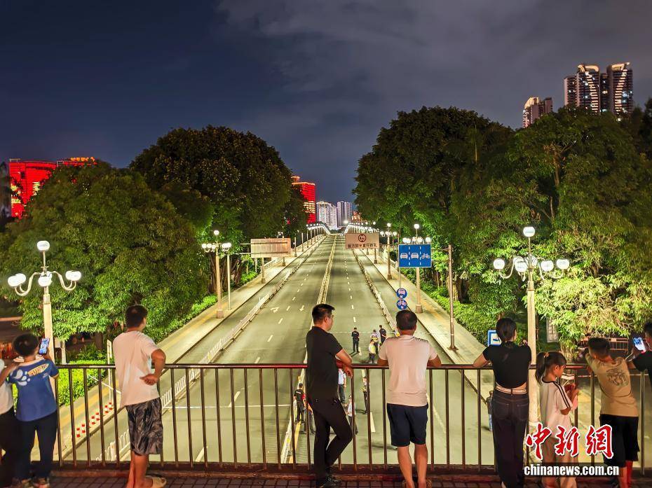10月3日,受左江、右江持续来水影响,广西南宁邕江水位持续上涨,邕江大桥实施交通管制。图为市民在高处查看情况。中新社记者 陈冠言 摄