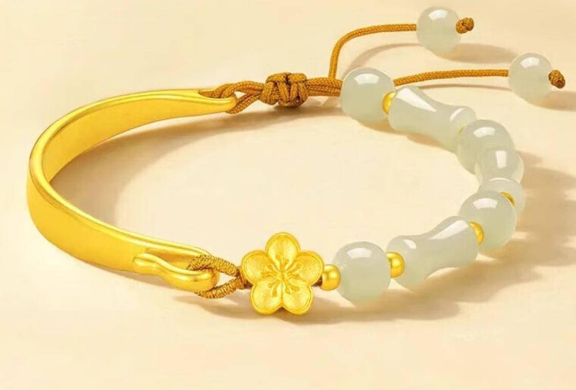 老凤祥桃花黄金手链女和田玉手串是一款结合了多种吉祥元素的精致饰品。这款手串将足金桃花元素与和田玉完美结合,约2.3克的重量设计轻盈精巧,非常适合日常佩戴。