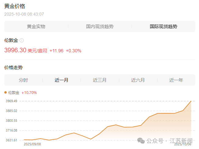 10月8日,国际现货黄金伦敦金价格涨到3996.30美元/盎司,逼近4000美元/盎司大关。