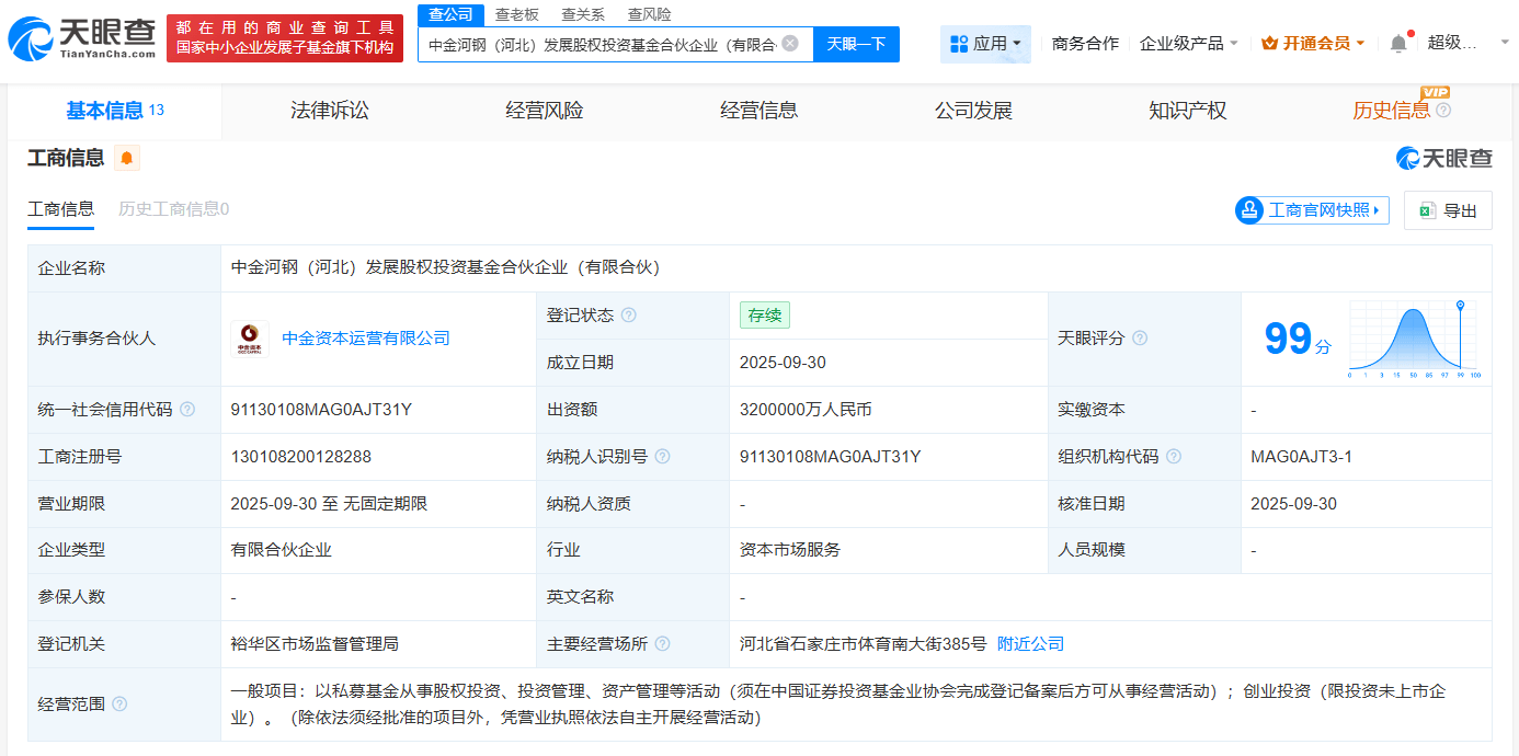 雷达财经讯,天眼查App显示,近日,中金河钢(河北)发展股权投资基金合伙企业(有限合伙)成立,执行事务合伙人为中金资本运营有限公司,出资额320亿人民币,经营范围包括创业投资,以私募基金从事股权投资、投资管理、资产管理等活动。合伙人信息显示,该基金由河钢集团有限公司、河钢集团投资控股有限公司、中金资本运营有限公司共同出资。