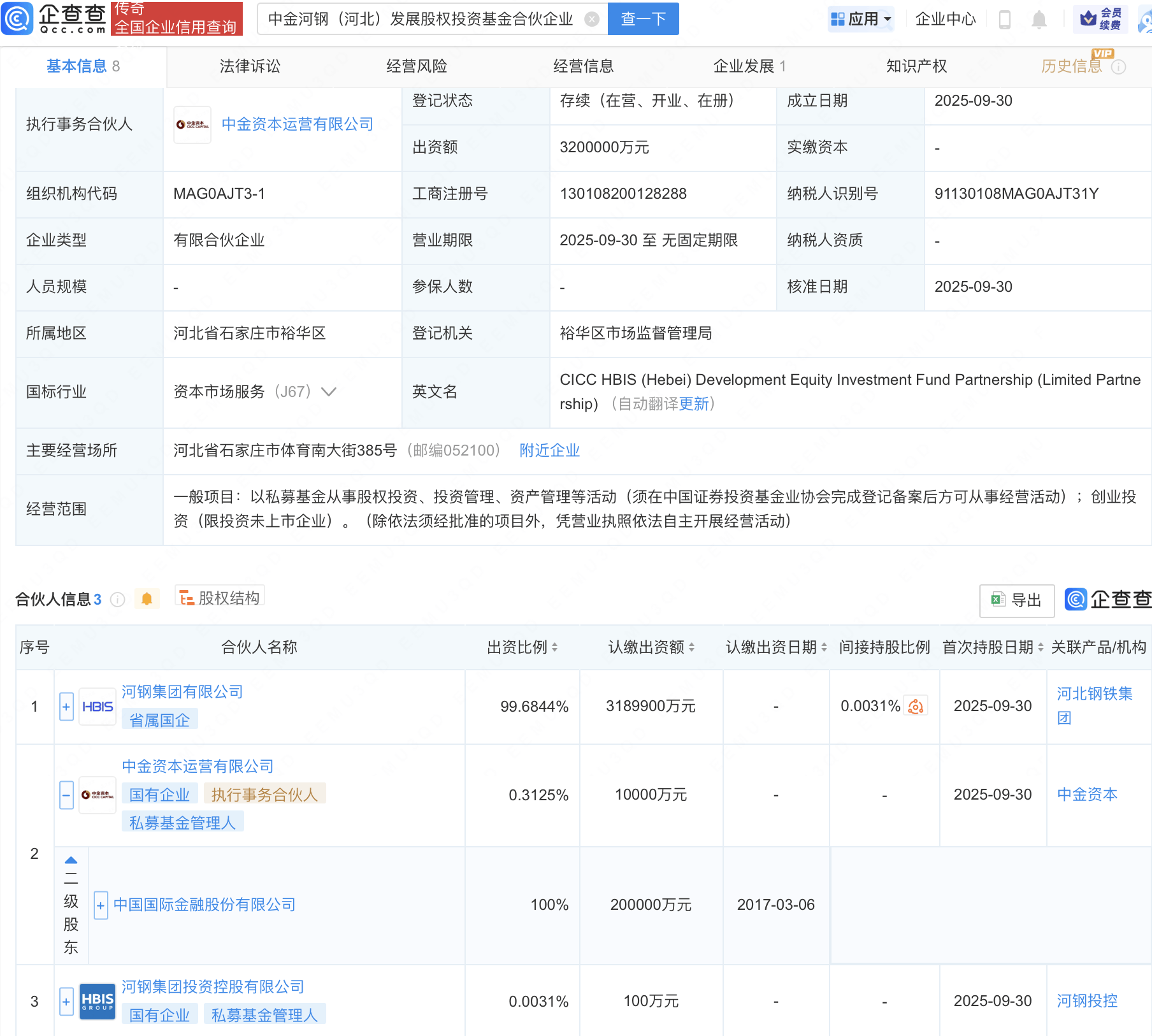 企查查APP显示,近日,中金河钢(河北)发展股权投资基金合伙企业(有限合伙)成立,出资额320亿元,经营范围包含:以私募基金从事股权投资、投资管理、资产管理等活动。企查查股权穿透显示,该企业由河钢集团有限公司、中金公司(601995)全资子公司中金资本运营有限公司等共同出资。