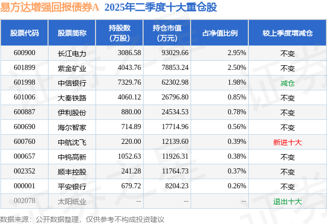 根据2025基金半年报公募基金重仓股数据,重仓该股的公募基金共7家,其中持有数量最多的公募基金为易方达基金的易方达增强回报债券A。易方达增强回报债券A目前规模为225.95亿元,最新净值1.396(9月30日),较上一交易日上涨0.22%,近一年上涨4.48%。该公募基金现任基金经理为王晓晨。王晓晨在任的基金产品包括:易方达投资级信用债债券A,管理时间为2013年9月10日至今,期间收益率为75.86%;易方达裕祥回报债券A,管理时间为2022年4月30日至今,期间收益率为18.63%;易方达安泽180天持有期债券A,管理时间为2024年1月24日至今,期间收益率为4.73%。