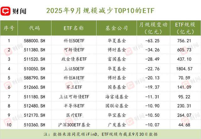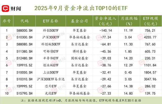 在资金净流出的ETF中,科创50ETF单月涨幅超11%,净值连创近年新高,随着净值上涨,部分投资者获利了结,9月净流出140.14亿元;总体上,9月市场在止盈宽基ETF、可转债ETF上体现得较为明显,沪深300ETF、科创板50ETF、可转债ETF、上证50ETF等资金净流出居前。