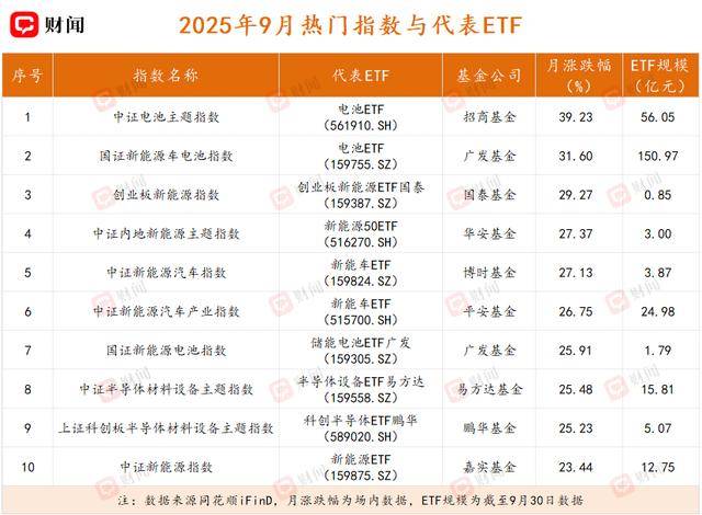 9月,新能源以及半导体主题ETF表现最为抢眼。其中广发基金旗下的电池ETF(159755)单月涨幅超30%,半导体设备ETF易方达(159558)涨幅也超过25%。这主要得益于固态电池等新技术突破的刺激,以及AI驱动下对算力基础设施的长期需求。