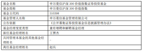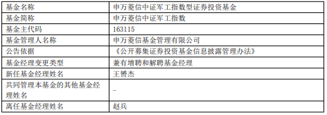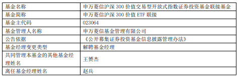 中国经济网北京10月9日讯 近日,申万菱信基金公告,赵兵离任申万菱信中证军工指数、申万菱信中证A500ETF、申万菱信沪深300价值ETF、申万菱信中证A500ETF联接、申万菱信沪深300价值指数、申万菱信沪深300价值ETF联接。