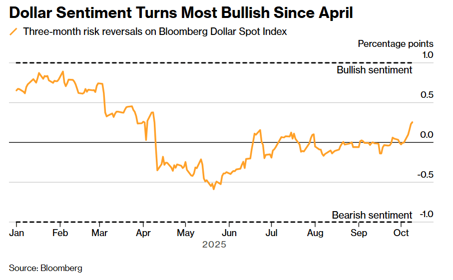 尽管美国政府停摆持续上演,冲击投资者们对于美元资产的持有信心,但是作为全球主要储备货币的美元的强弱衡量指数仍处于约两个月高位,凸显出美元近期相对于其他主权货币的强势地位。亚洲和欧洲的交易员们表示,对冲基金正在加码期权押注,认为相对多数主要货币的美元反弹浪潮将延续至年底。