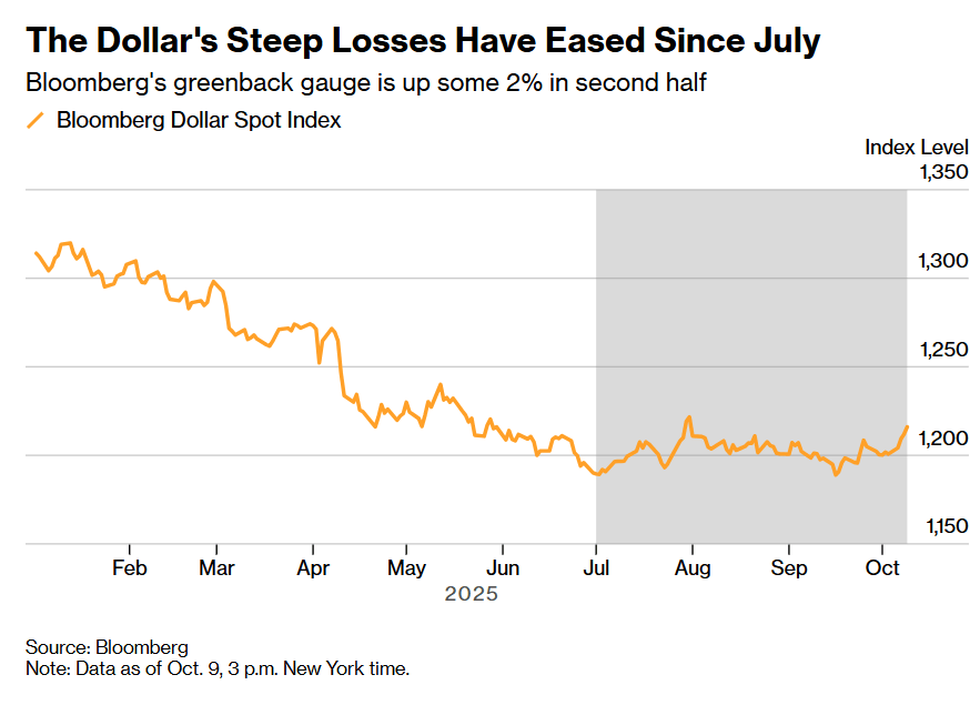 彭博美元现货指数自年中以来现已上涨约2%,此前其上半年跌幅为数十年来最陡。2025年初,在唐纳德·特朗普再一次就任总统后暂缓实施全面关税之际,出于对通胀将温和到足以令美联储恢复降息的判断,美元下滑。