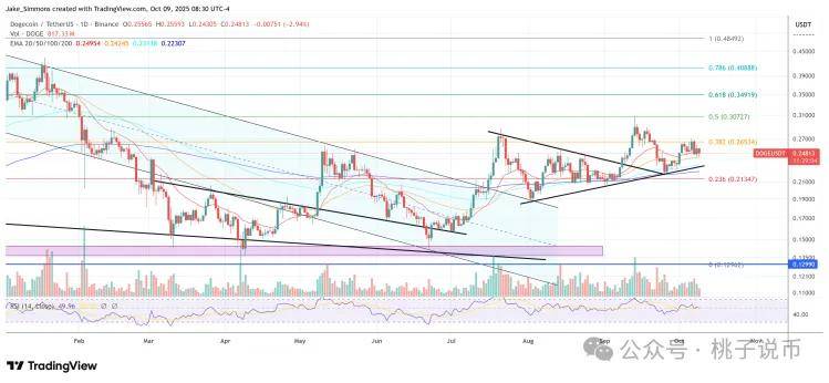 现货价格在0.25-0.26美元区间震荡,前阻力已转为坚实支撑。“我永远搞不懂,为什么总有人说狗狗币创下新低就意味着周期终结、项目凉凉,”这位交易员调侃道,指出现春季以来持续的高低点(HL)序列,暗示阶梯状上涨格局仍在。