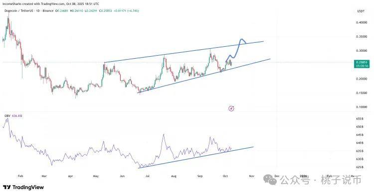 三种观点交汇:DOGE现货图延续上升通道,OBV改善;长线下行趋势突破后HL序列完好;对BTC相对强势获更高时间框架均线回撤线下方确认。