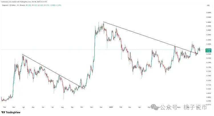 粤语猫的每日观点聚焦市场结构而非技术指标。图表清晰勾勒出从去年低点至高点的下行趋势线——连接0.48美元峰值与多点跌破——已被有效突破并回测确认。