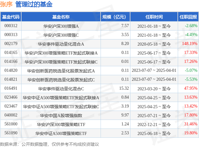 华安中证1000指数增强A基金经理变动:增聘张序为基金经理
