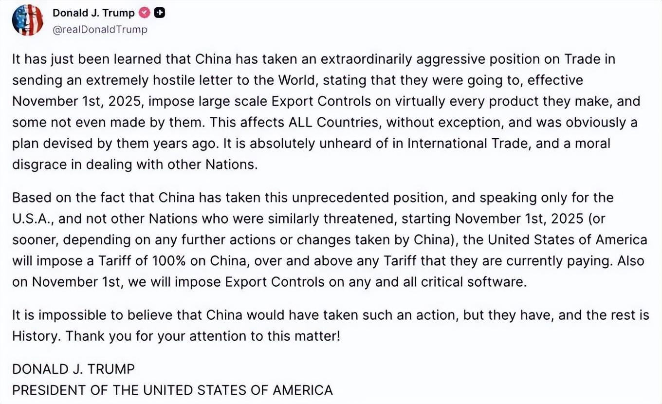 10月10日,美国总统特朗普在社交媒体上发布了一则震撼的消息:自11月1日起,美国将对所有从中国进口的商品加征100%的新关税。他特别强调,这一税率“远高于目前中国支付的任何关税水平”。此言一出,全球市场瞬间紧张,华尔街的交易员纷纷抛售股票,市场的涨幅迅速消失。投资者开始转向黄金和债券等避险资产,甚至连之前表现强劲的美元也开始回落。全球都在担忧,贸易战是不是又要升级了?特朗普这番话是认真的吗,还是仅仅是在虚张声势?而面对这一威胁,中国为何依然显得从容不迫?