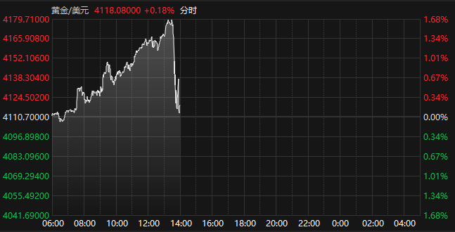 据Choice数据,10月14日,国际现货黄金冲高回落,截至14:00报4118.08美元/盎司,短线下挫超1%。