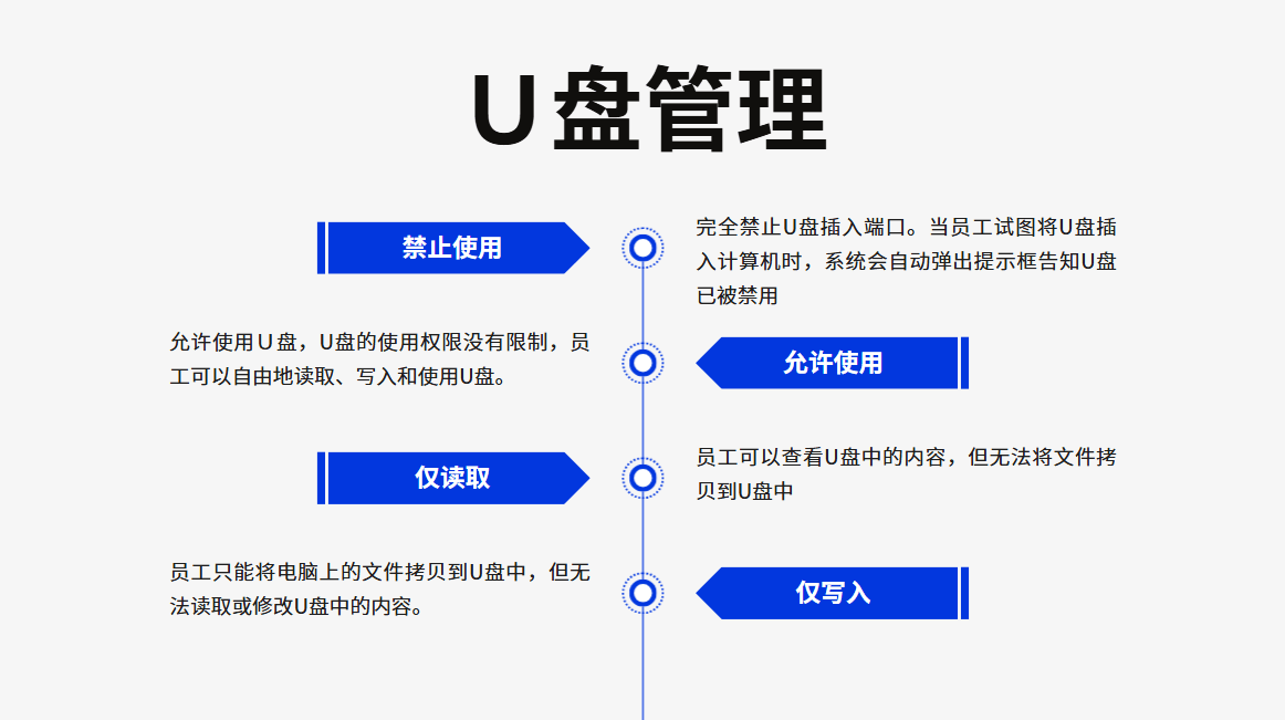 (4)U 盘管理:可以对接入终端的USB设备实行注册授权制,未经登记的 U 盘无法接入系统,支持对授权 U 盘内文件加密,确保数据脱离企业环境后安全。