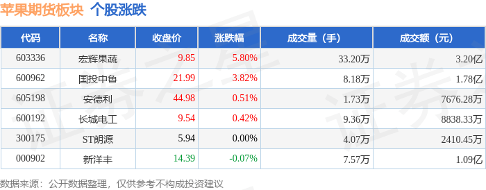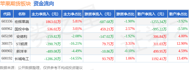 从资金流向上来看,当日苹果期货板块主力资金净流入73.15万元,游资资金净流出132.82万元,散户资金净流入59.67万元。苹果期货板块个股资金流向见下表:
