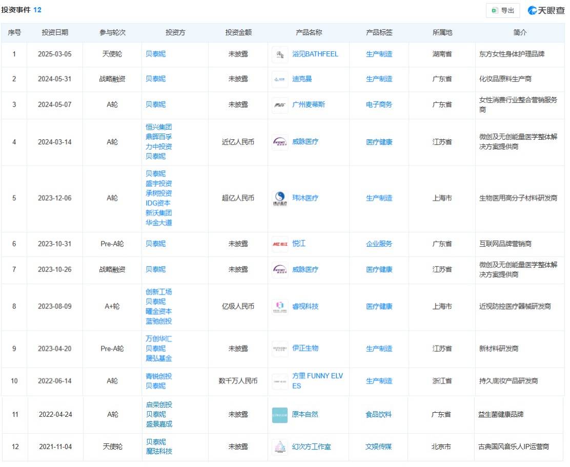 近年来,贝泰妮通过自建及合作基金加速投资布局,已成立或投资约9家基金公司,覆盖AI、消费医疗、美妆个护等领域。
