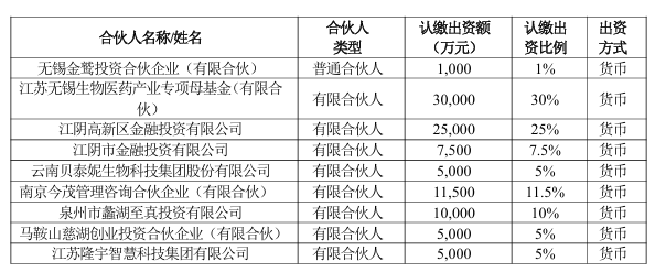 公告显示,除贝泰妮自身外,参与本次有限合伙的企业还包括无锡金鹫投资合伙企业(有限合伙)、江苏无锡生物医药产业专项母基金(有限合伙)、江阴高新区金融投资有限公司、江阴市金融投资有限公司、南京今茂管理咨询合伙企业(有限合伙)、泉州市蠡湖至真投资有限公司、马鞍山慈湖创业投资合伙企业(有限合伙)、江苏隆宇智慧科技集团有限公司。