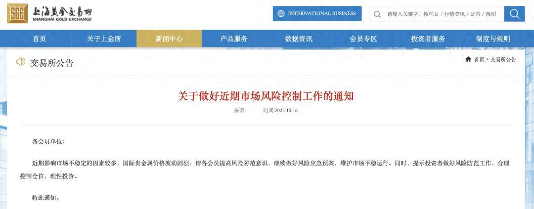 今天(10月16日),上海黄金交易所网站向各会员单位发布“关于做好近期市场风险控制工作的通知”: