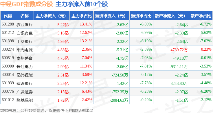 中经GDP(399399)指数十大成份股详情如下: