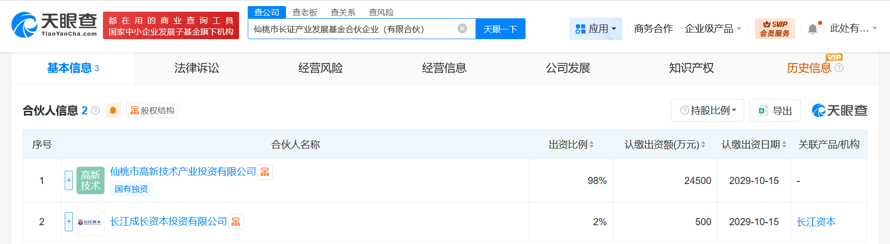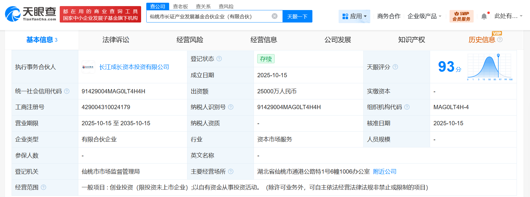 雷达财经讯,天眼查App显示,近日,仙桃市长证产业发展基金合伙企业(有限合伙)成立,执行事务合伙人为长江成长资本投资有限公司,出资额2.5亿人民币,经营范围为创业投资、以自有资金从事投资活动。合伙人信息显示,该基金由仙桃市高新技术产业投资有限公司、长江成长资本投资有限公司共同出资。