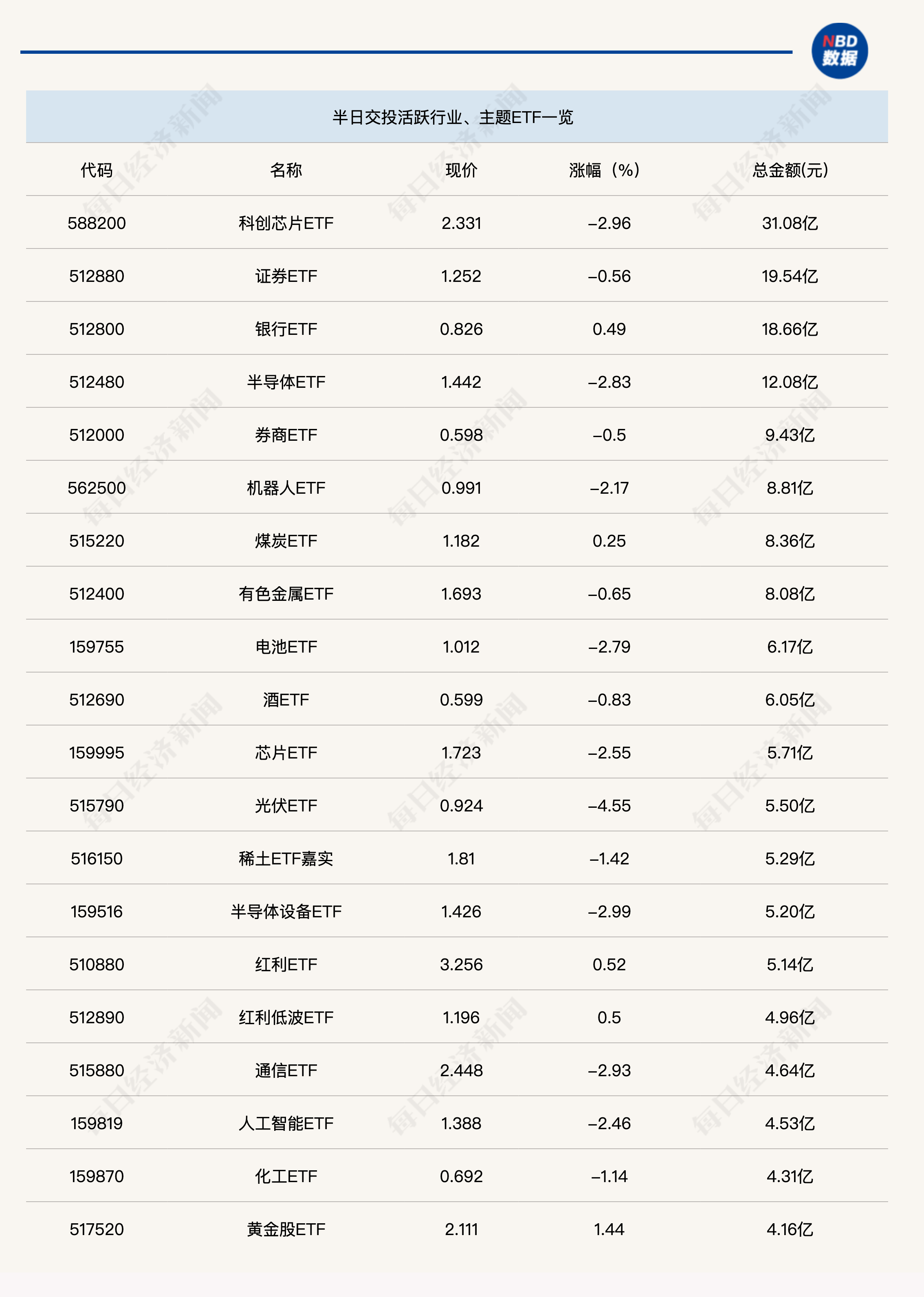 今日上午,随着科技板块整体回落,与半导体、芯片相关的行业ETF交投活跃。科创芯片ETF(588200)半日成交金额高达31.08亿元;半导体ETF(512480)半日成交金额也超过10亿元,达到12.08亿元。