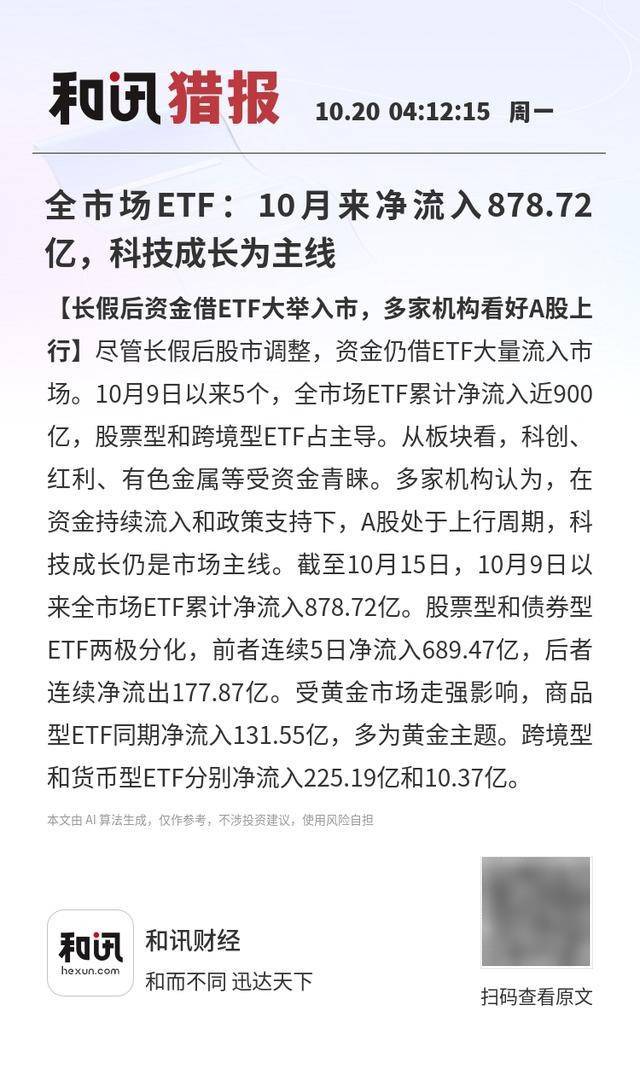 【长假后资金借ETF大举入市,多家机构看好A股上行】尽管长假后股市调整,资金仍借ETF大量流入市场。10月9日以来5个,全市场ETF累计净流入近900亿,股票型和跨境型ETF占主导。从板块看,科创、红利、有色金属等受资金青睐。多家机构认为,在资金持续流入和政策支持下,A股处于上行周期,科技成长仍是市场主线。截至10月15日,10月9日以来全市场ETF累计净流入878.72亿。股票型和债券型ETF两极分化,前者连续5日净流入689.47亿,后者连续净流出177.87亿。受黄金市场走强影响,商品型ETF同期净流入131.55亿,多为黄金主题。跨境型和货币型ETF分别净流入225.19亿和10.37亿。