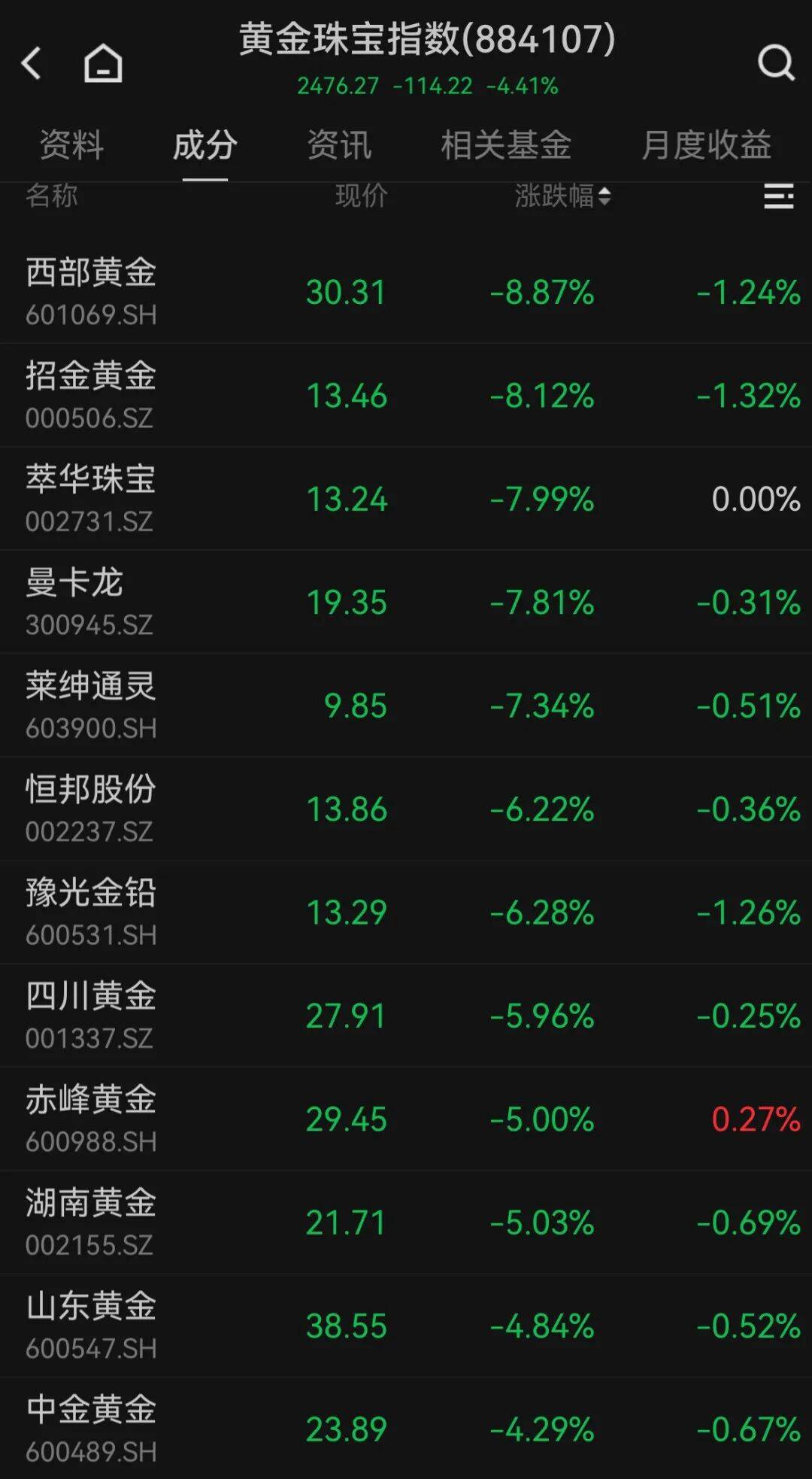 10月20日,黄金概念股多数下跌,西部黄金跌近9%,招金黄金跌超8%,萃华珠宝、曼卡龙、莱绅通灵等跌幅居前。