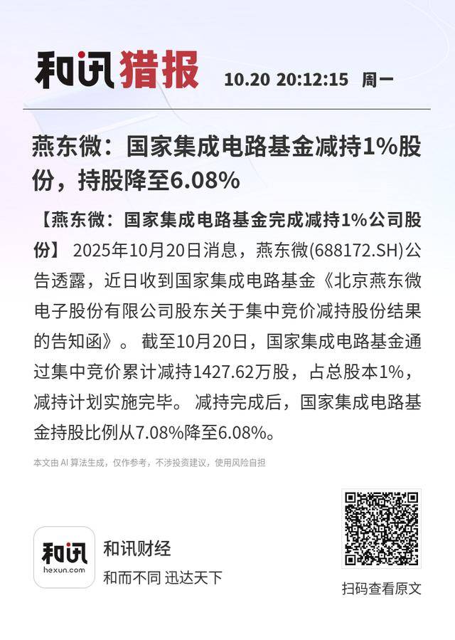 【燕东微:国家集成电路基金完成减持1%公司股份】2025年10月20日消息,燕东微(688172.SH)公告透露,近日收到国家集成电路基金《北京燕东微电子股份有限公司股东关于集中竞价减持股份结果的告知函》。 截至10月20日,国家集成电路基金通过集中竞价累计减持1427.62万股,占总股本1%,减持计划实施完毕。 减持完成后,国家集成电路基金持股比例从7.08%降至6.08%。