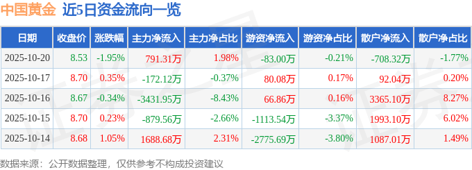 证券之星消息,截至2025年10月20日收盘,中国黄金(600916)报收于8.53元,下跌1.95%,换手率2.79%,成交量46.79万手,成交额3.99亿元。