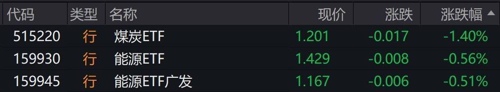 受盘面影响,煤炭ETF跌超1%,能源ETF跌约0.5%。