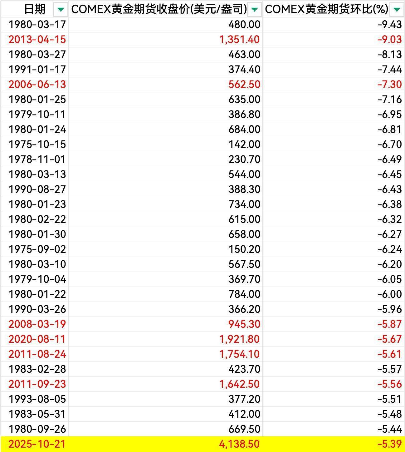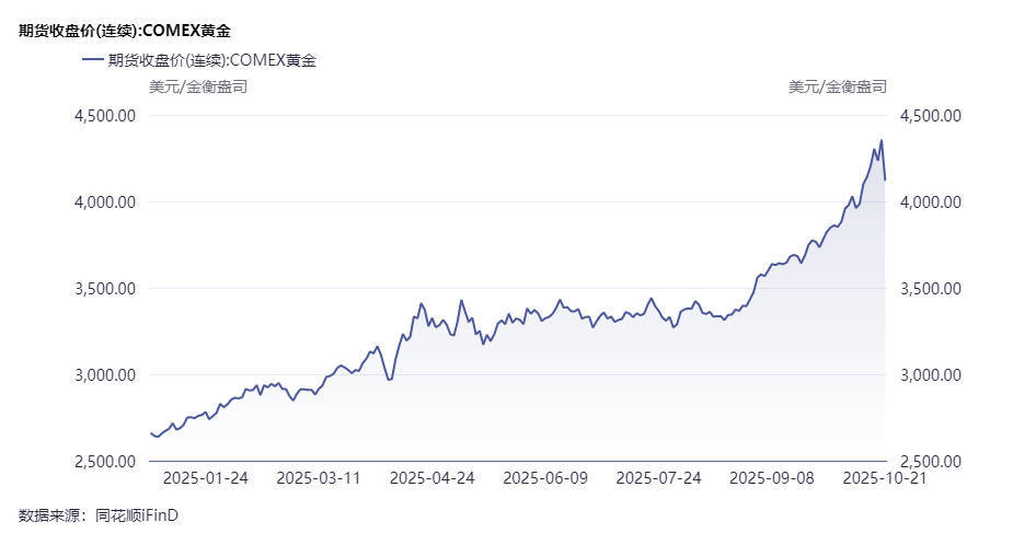 黄金大跌的走势大约始于北京时间10月21日下午3点,COMEX黄金价格一路从4350美元/盎司的水平大幅下跌至4130美元/盎司附近,最终以横盘震荡结束全天的交易,当日跌幅达5.39%,创下今年以来的最大单日跌幅。