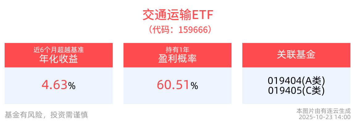 回撤方面,截至2025年10月22日,交通运输ETF近半年最大回撤4.93%,相对基准回撤0.04%。