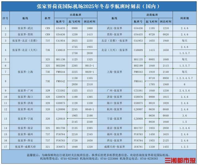 10月26日起,张家界机场将新... 三湘都市报10月23日讯(全媒体记者 李致远 通讯员 刘思涵)10月23日,记者从张家界荷花国际机场...