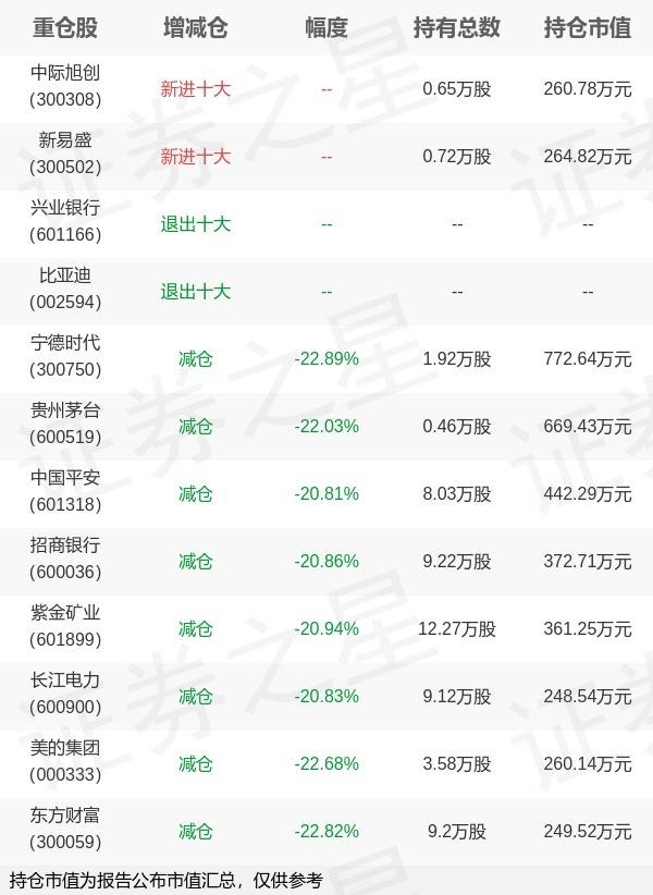 证券之星消息,10月28日天弘基金旗下陈瑶管理的天弘沪深300交易型开放式指数基金联接基金公布三季报,近1年净值增长率20.65%。与上一季度相比,该基金前十大重仓股新增中际旭创,新易盛;其中宁德时代持仓占比0.09%,为该基金第一大重仓股;兴业银行,比亚迪等退出前十大重仓股;详细数据如下: