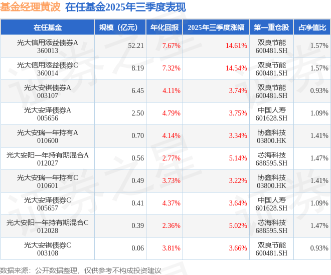 证券之星消息,截止2025年三季度末,基金经理黄波旗下共管理10只基金,本季度表现最佳的为光大信用添益债券A(360013),季度净值涨14.61%。