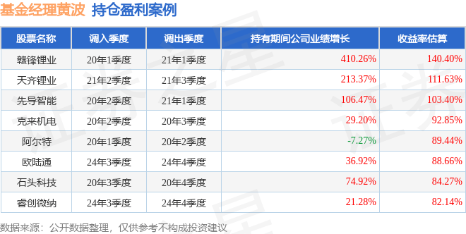 黄波管理的光大信用添益债券A基金在20年1季度买入赣锋锂业,在持有1年又0个季度后在21年1季度卖出。持有期间的估算收益率为140.4%,持有期间赣锋锂业在2020年到2021年的年报归属净利润增幅达410.26%。