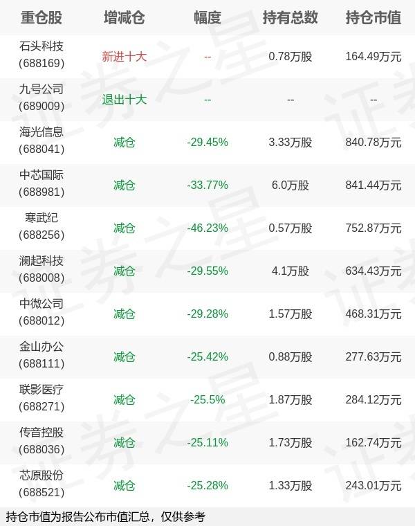 证券之星消息,10月28日华夏基金旗下荣膺管理的华夏上证科创板50成份交易型开放式指数基金发起式联接基金公布三季报,近1年净值增长率45.56%。与上一季度相比,该基金前十大重仓股新增石头科技;其中海光信息持仓占比0.08%,为该基金第一大重仓股;九号公司等退出前十大重仓股;详细数据如下: