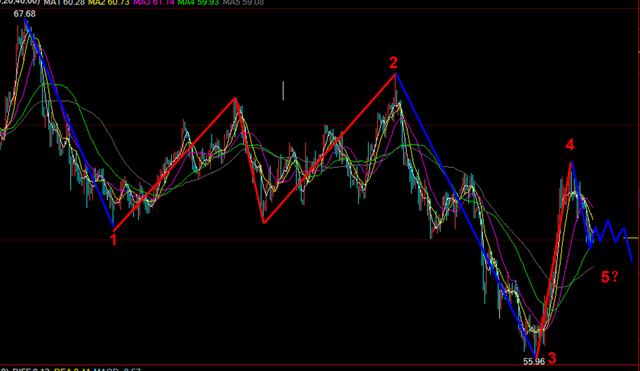 在前期的数浪子浪3-1浪从65.77跌到60.06美元,跌幅为5.71美元,3-2浪从从60.06美元涨到62.34美元,涨幅为2.28美元,3-2浪回撤了3-1浪的39.9%左右,3-1浪从62.34美元跌到55.96美元,跌幅为6.38美元,而经过上周五的走势之后,就得重新数浪了,也需55.96美元就是主跌3浪的终点了,而目前的上涨是4浪的上涨,这个是从行情从67.68美元这样数浪得出的55.96美元是3浪的终点,因为如果按照前期的数浪思路来的话,也就是目前行情从55.96美元上涨到62.59美元是3-2浪的,那么行情还有经过3-3以及3-5浪的下跌才能走完完整的主跌3浪,最后还有一个主跌5浪,那么按照这样的浪型走势,行情最终就要跌到45美元左右了,而把上周这波上涨看着是4浪,目前的下跌是5浪的开始,那么行情最终是破55美元去试探50美元关口才能走完主跌5浪了,不管怎样,至少在方向是一致的,那我们今日继续用小的止损去博弈空。