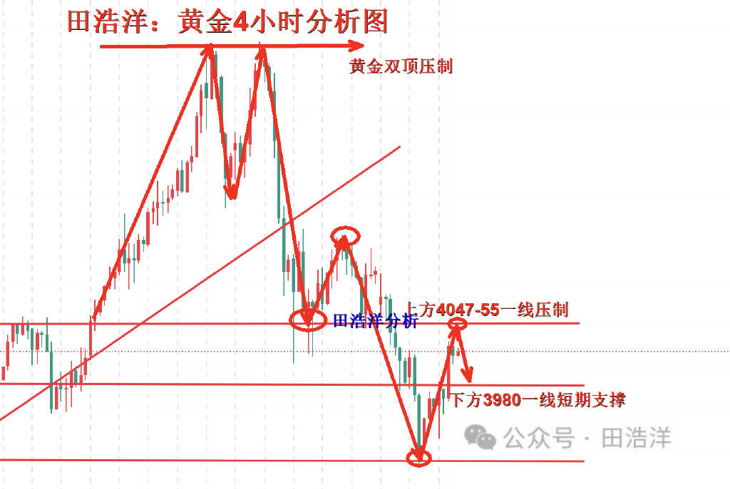 从4小时行情走势来看,目前上方关注短期压制4047-55一线,短期关注3985-90一线支撑,重点关注关注4070一线压制,操作上以区间把握为主,中间位置一律多看少动谨慎追单,耐心等待关键点位进场。具体操作策略我会在盘中提示,及时关注。